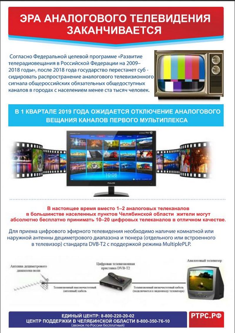 К концу 2018 года жители Челябинской области получат возможность принимать и мультиплекс РТРС-2 (СТС, ТНТ, РенТВ, Пятница, Спас, Домашний, Звезда, ТВ3, Мир, МузТВ). Цифровое эфирное телевидение – это новый этап развития телевидения во всем мире, который приходит на смену аналоговому телевещанию. Аналоговое телевидение значительно уступает цифровому в качестве картинки и звука и при этом требует большого частотного ресурса. Поэтому, дальнейшее развитие «аналога» технически и экономически нецелесообразно. С 2018 года «аналог» будет постепенно вытесняться «цифрой» вплоть до полного отключения, как это уже сделано во многих странах мира. Цифровой эфирный сигнал доступен вне зависимости от удаленности и размера населенного пункта. При этом в отличие от пользователей сетей кабельных и спутниковых операторов зрители цифрового эфирного телевидения не платят абонентскую плату за телепросмотр.